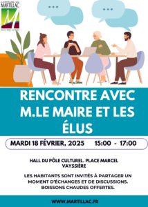 Mardi 18 février 2025, de 15h à 17h.Venez partager, au Hall du Pôle Culturel, un moment d’échange et de discussions avec les Élus, à votre écoute.