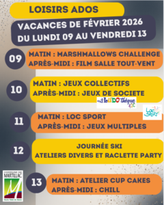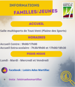 Merci de vous rapprocher du service des Loisirs Ados par e-mail à : loisirs.ados@mairie-martillac.fr